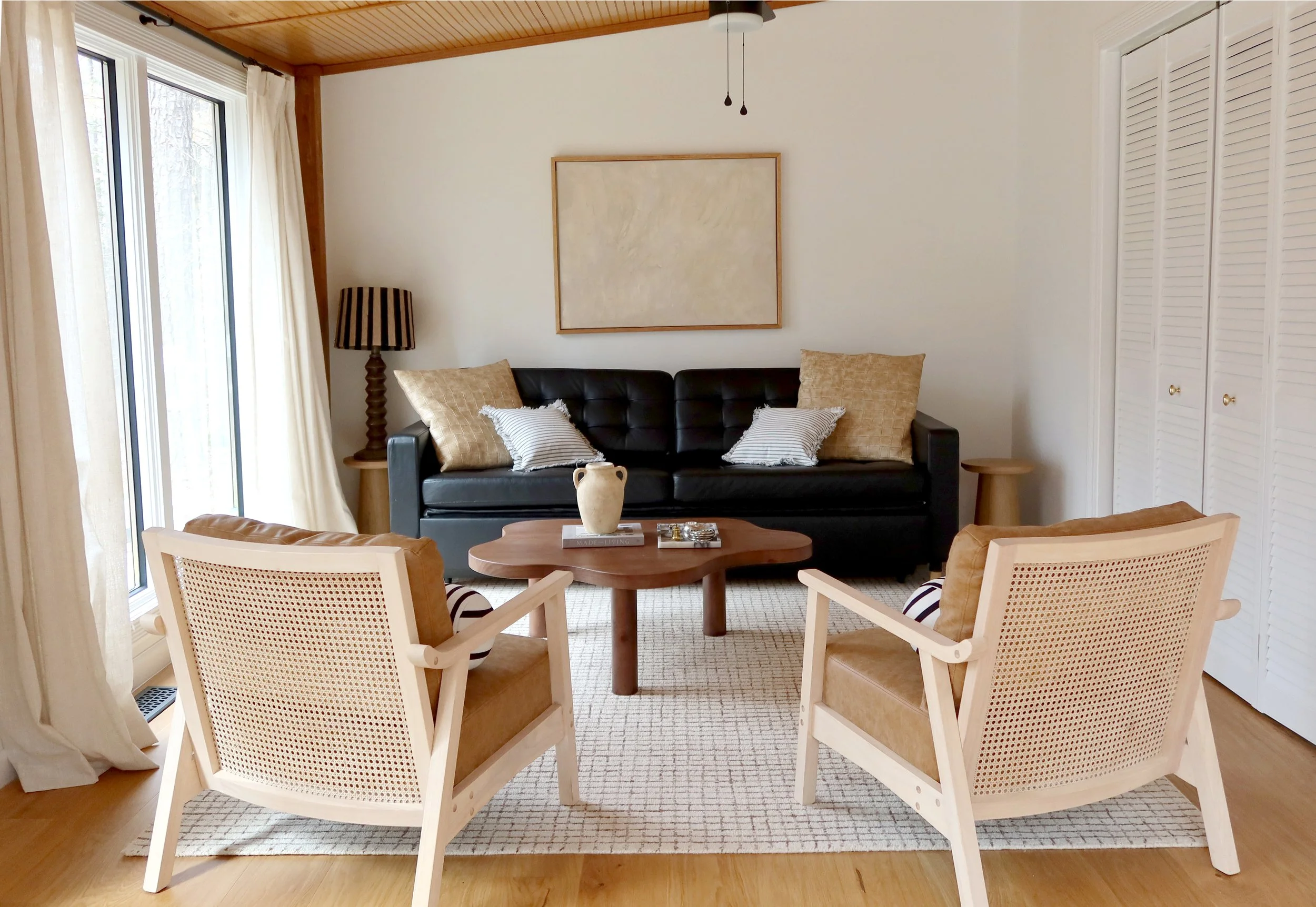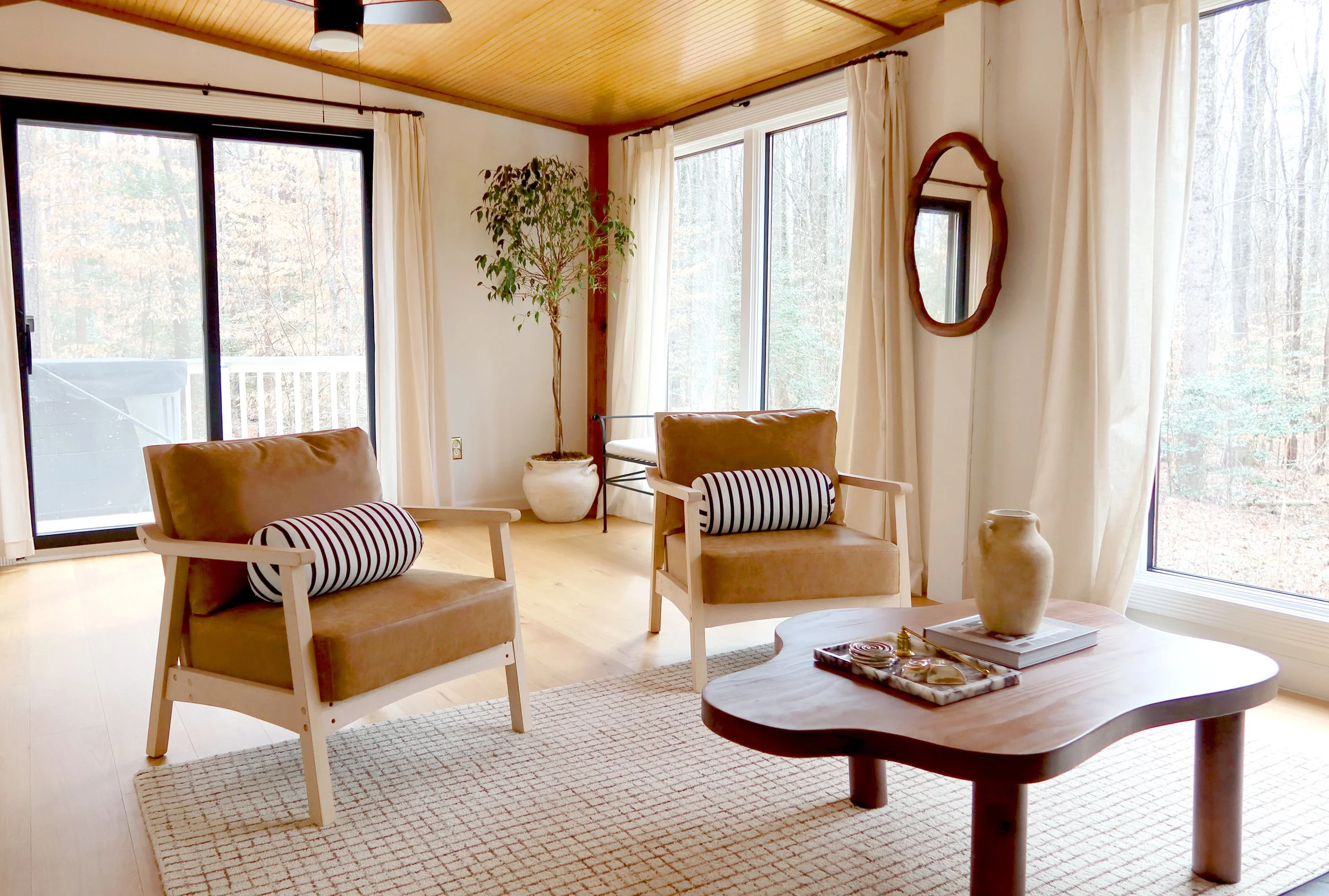 On the main level is the sunroom, where the surrounding expansive windows frame the ever-changing surrounding forest. Sliding doors open to the deck and hot tub. This space offers the perfect spot to lose yourself in a novel, engage in lively game nights, or simply bask in the warm setting sun. As day turns to night, the sofa converts to a full size sleeper for an additional sleeping space.