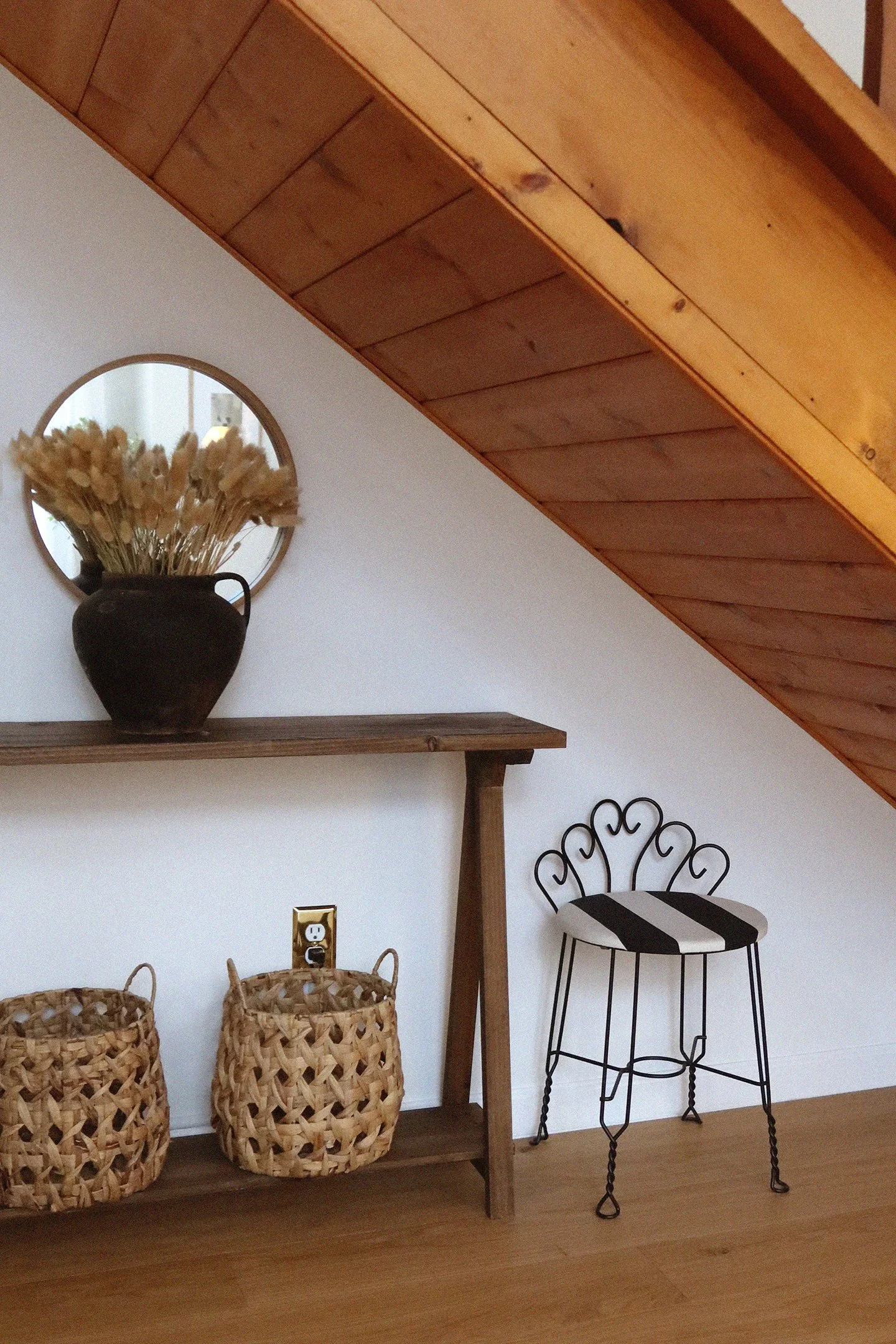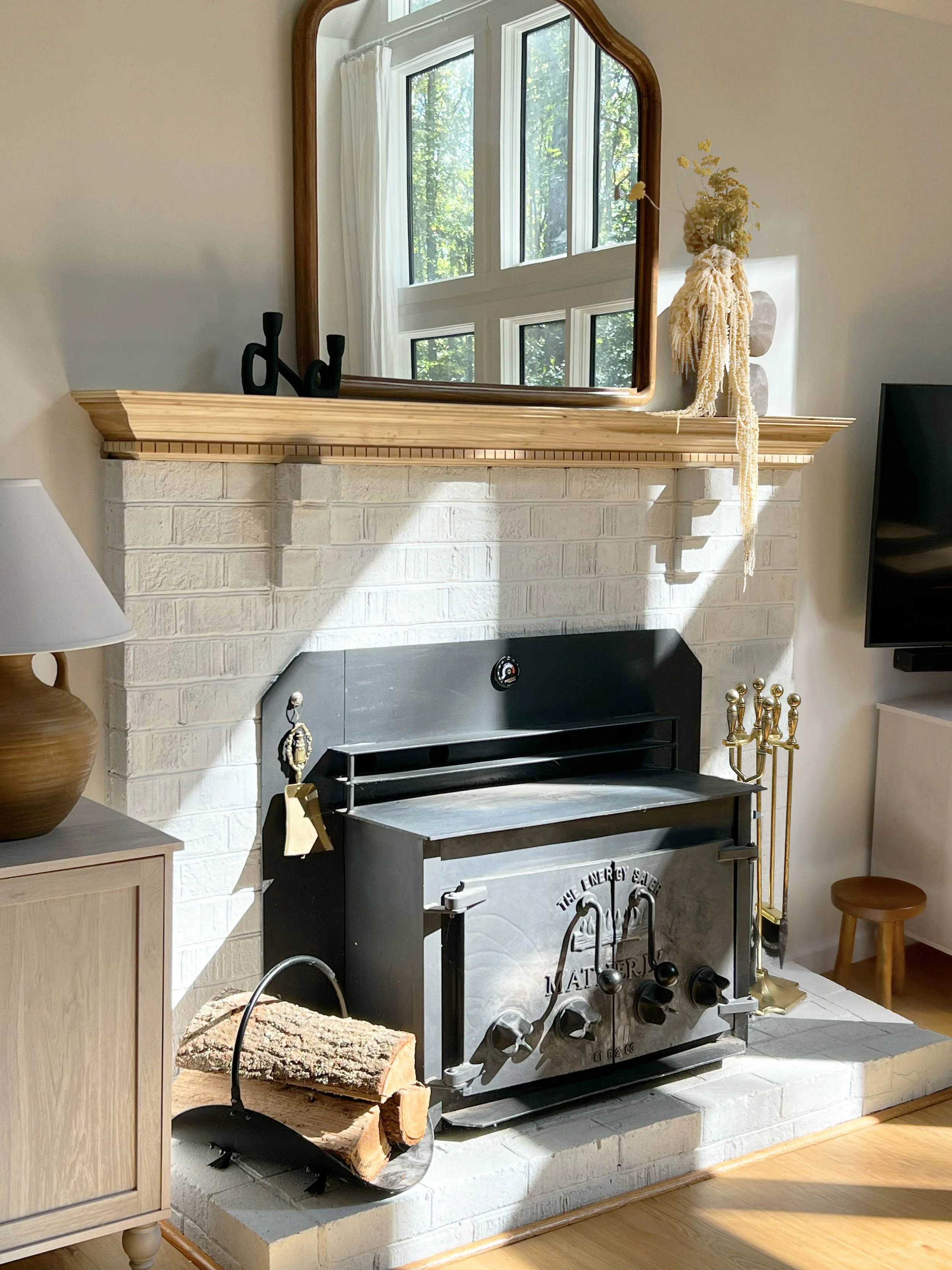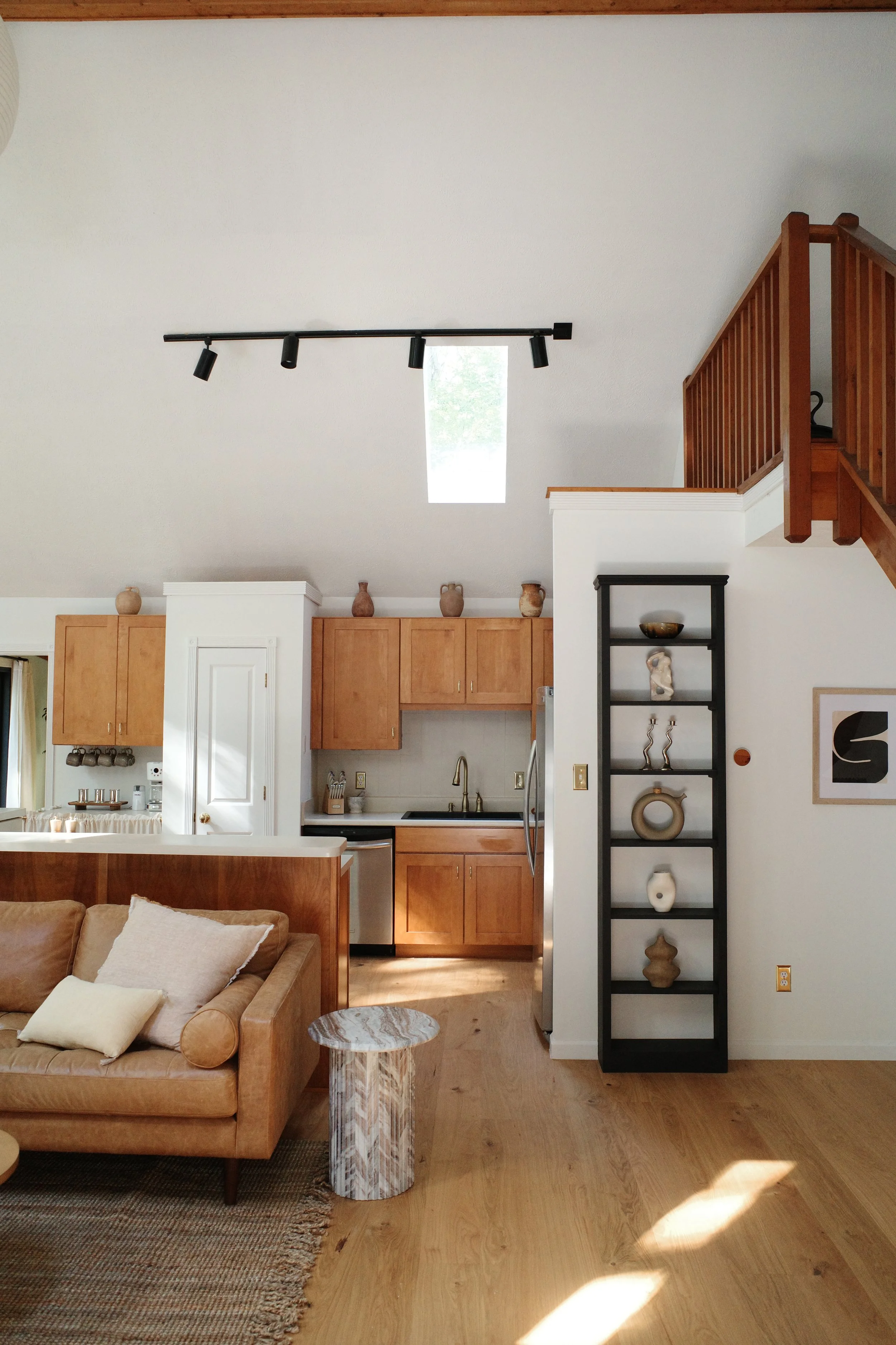 As you step inside, you'll be greeted by an expansive main level, where the living room, dining area, and kitchen flow into one another. At the heart of this open space is the floor-to-ceiling A-frame window in front of the dining table that brings the outside in. The living area features a TV with Roku complemented by a high-quality soundbar, creating an immersive entertainment experience. Lastly, the charming wood stove style fireplace casts a warm glow, adding a touch of rustic charm.